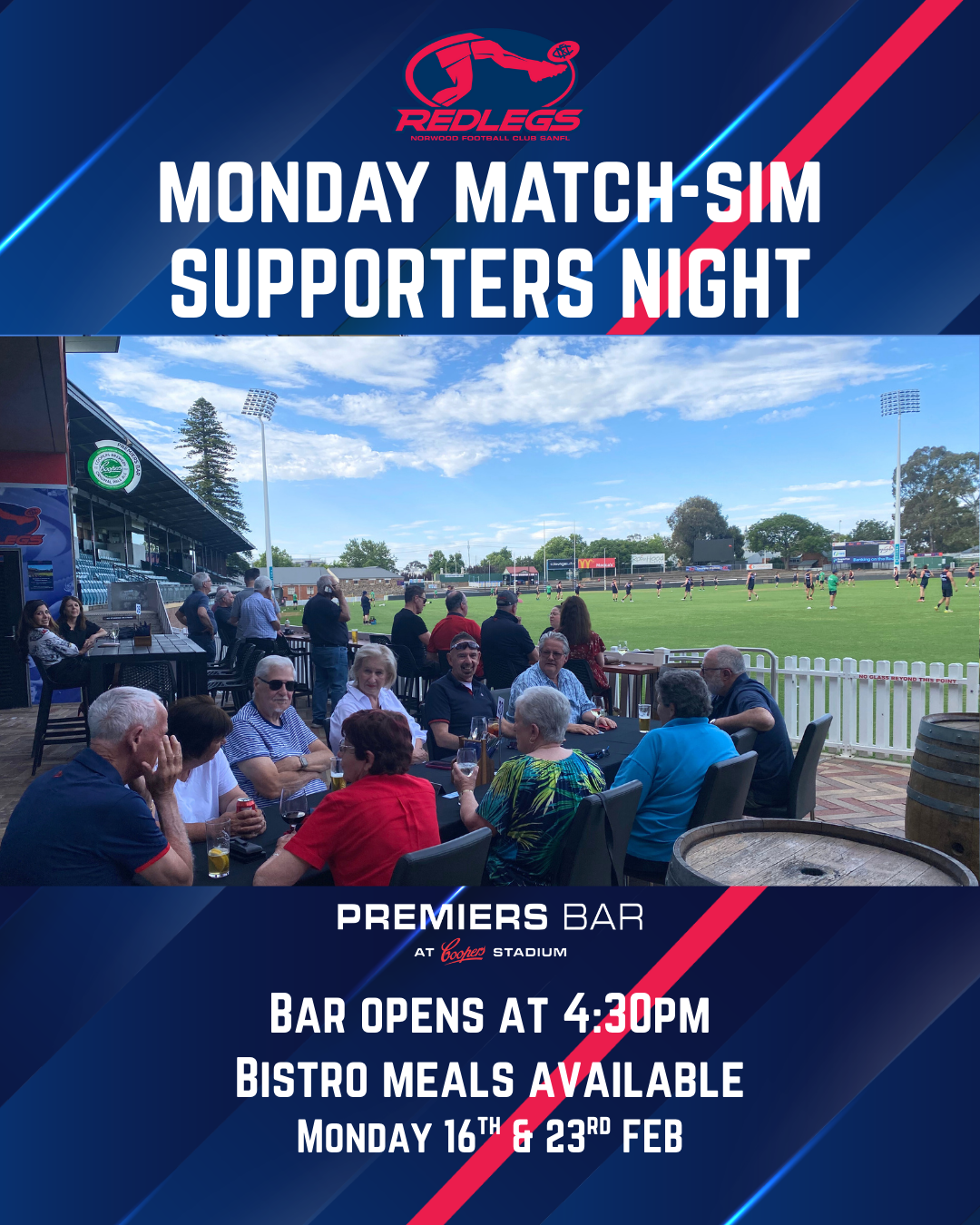 The Premiers Bar will be open for match-sim and internal trials on Monday 16th and 23rd of February. Bistro meals available.Bookings > reception@norwoodfc.com.auThursday Supporters Nights will continue to run as normal.