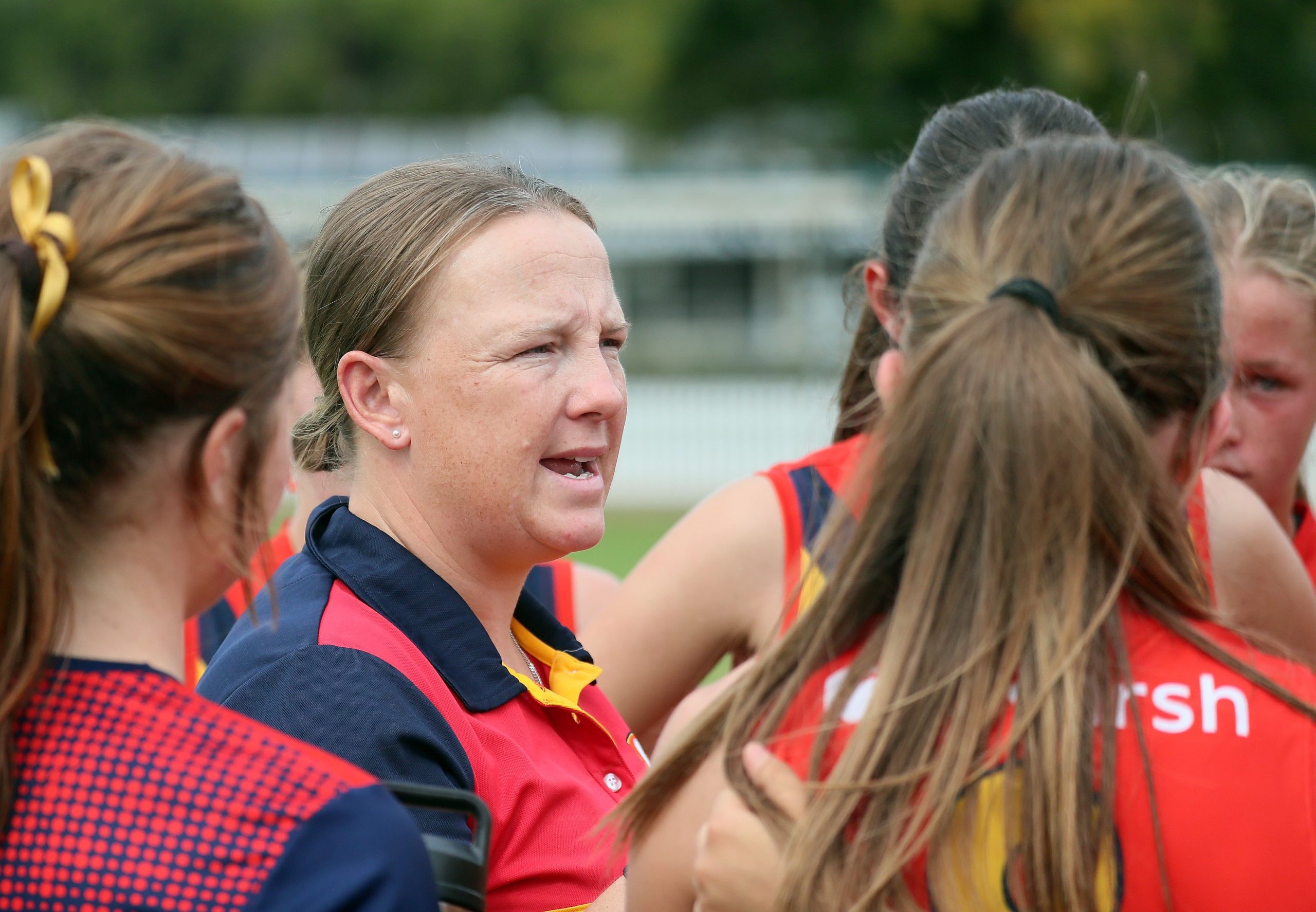 Triple championship-winning coach Bek McMahon will be looking to steer her SA U16 girls to an incredible fourth successive AFLW U16 Girls Championship win. Picture – Peter Argent
