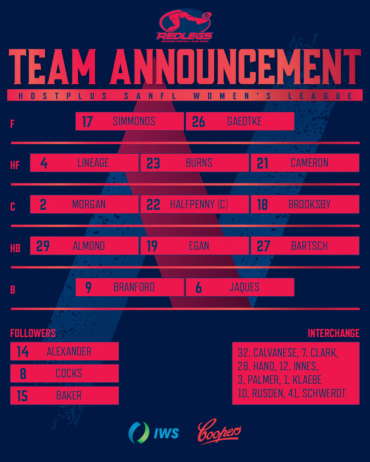 The Redlegs have confirmed one debutant for the Round 2 match, with off-season recruit Abby Klaebe selected to play her first SANFLW game for Norwood. She has been a star at local level for Payneham NU Football Club, having won the Division 1 League Medal in 2024.